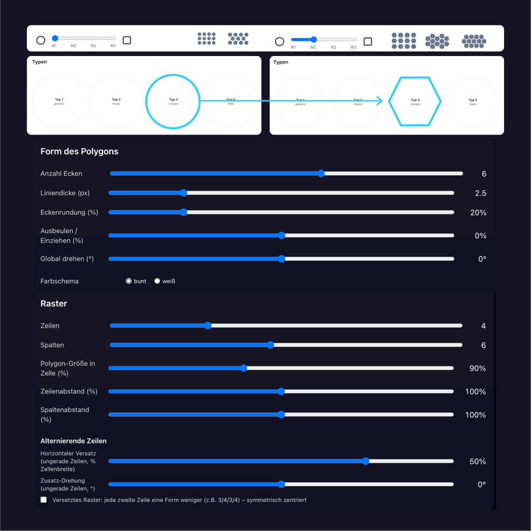Das Raster hier ist kein klassisches Layout-Grid, sondern ein Konfigurator für Formen im Dashboard. Über Slider lassen sich Zeilen, Spalten, Abstände und die Form selbst steuern – vom Vieleck bis zum Kreis.