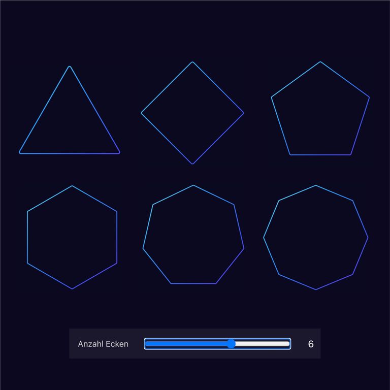 Also machen wir aus „dem Dreieck“ ganz einfach „das n-Eck“: Ein Regler für die Anzahl der Ecken, ein bisschen Geometrie unter der Haube – und schon springt die Form von Dreieck zu Quadrat, Pentagon, Hexagon… bis hin zum kompletten Spinnennetz.