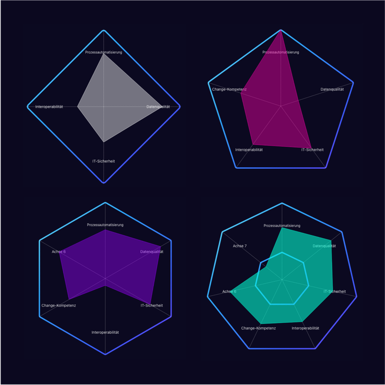 3 Ecken = 3 KPIs, 5 Ecken = 5 Dimensionen, 8 Ecken = 8 Blickwinkel auf denselben Sachverhalt.
