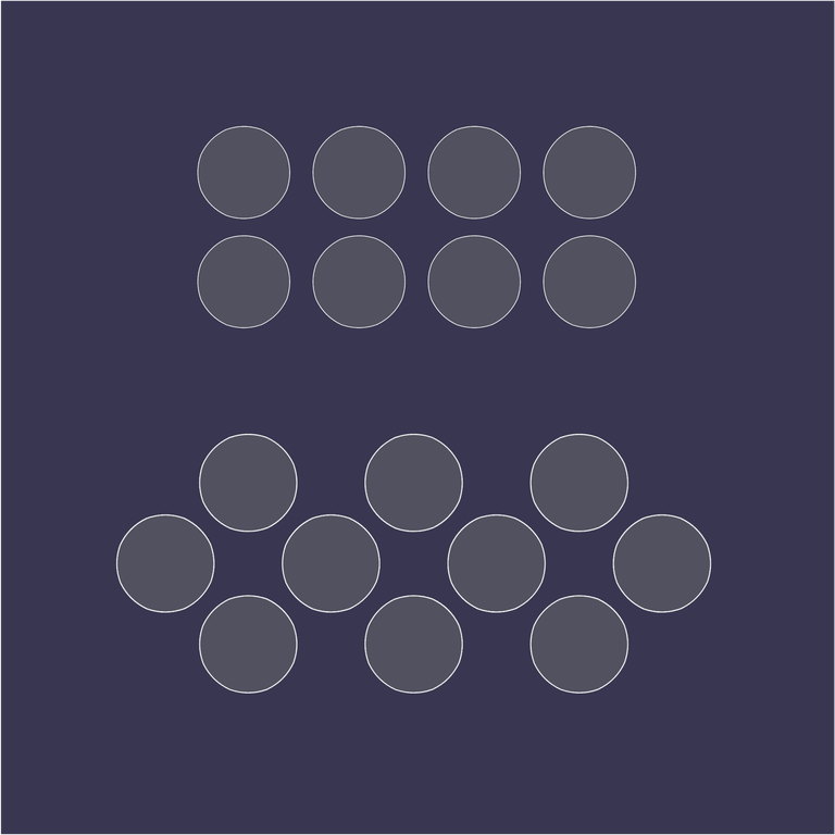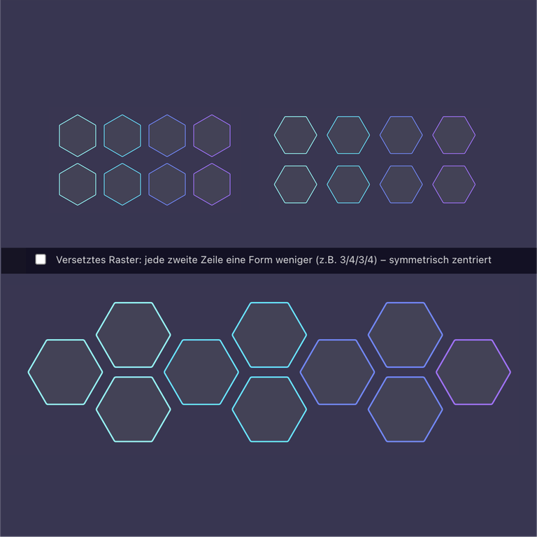 Oben kompakte Hexagon-Gitter, unten versetzte Zeilen im Honeycomb-Muster. Über die Einstellungen für Zeilenversatz entsteht ein vernetzter Eindruck, ohne zusätzliche Linien.
