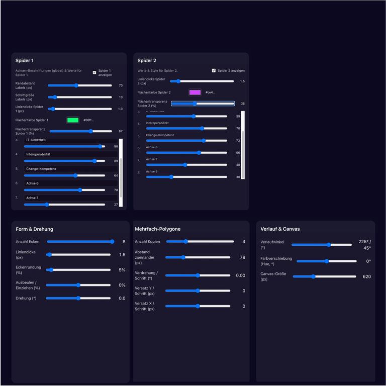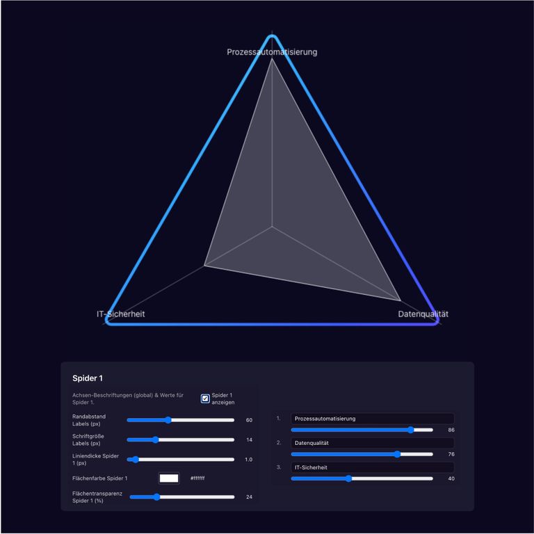 Wir könnten das theoretisch unbegrenzt wiederholen, aber irgendwann sieht man nur noch Daten-Salat. Also halten wir es bewusst reduziert und fokussiert: lieber zwei, maximal drei Spinnen, dafür klar lesbar.
