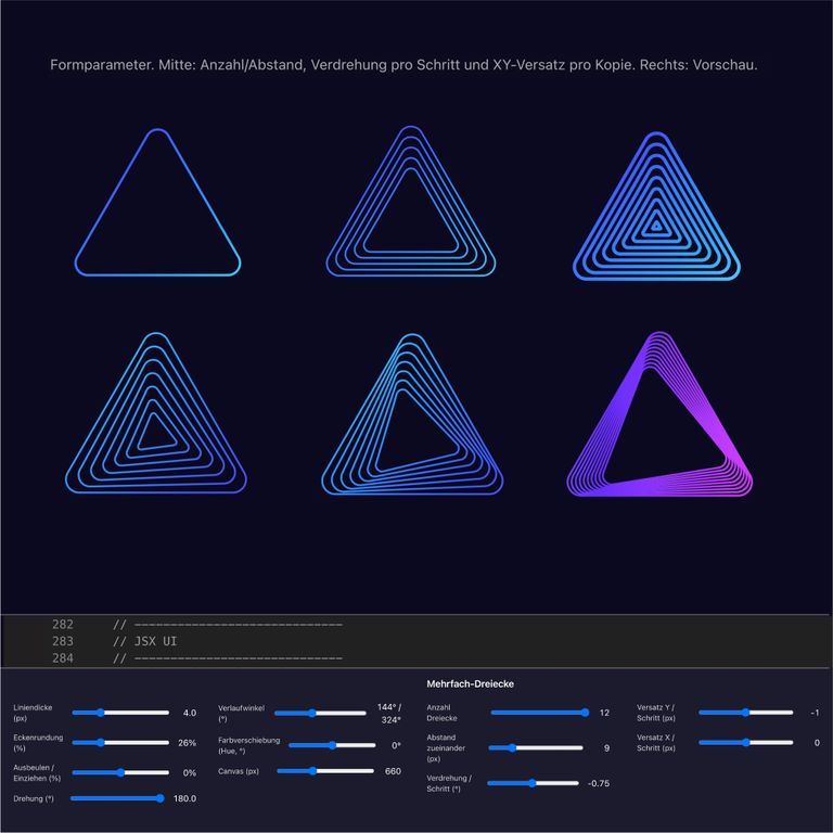 Jetzt wird gestapelt. Mehrfach-Dreiecke, Abstand, Anzahl, Verdrehung pro Schritt, XY-Versatz, Verlaufswinkel – alles steuerbar. Aus einer Form wird ein kleines System, das plötzlich in alle Richtungen eskalieren kann.