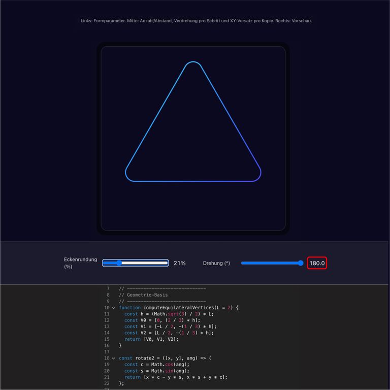 Am Ende steht dieses eine Motiv: ein mehrfach laufendes, weich gerundetes Dreieck mit Farbverlauf – genau in der Optik, die ich am Anfang im Kopf hatte, nur jetzt voll parametrisch und sauber im Code verankert.
