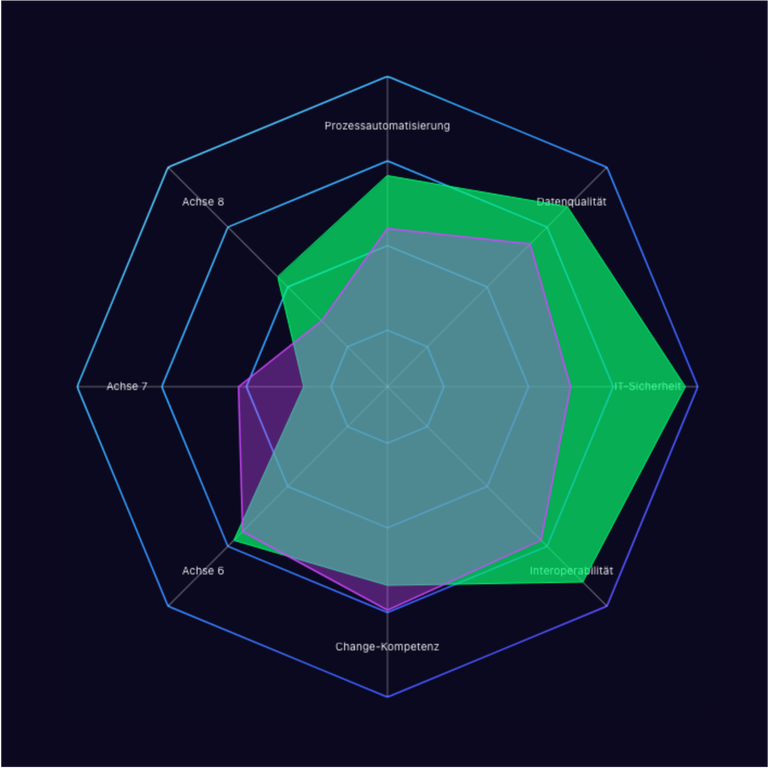 Anders als bei einer dekorativen Liniengrafik tragen Radarcharts wirklich Information. Pro Achse steht ein Kriterium, und der Wert läuft von Minimum bis Maximum – bei uns sauber skaliert von 0 bis 100.