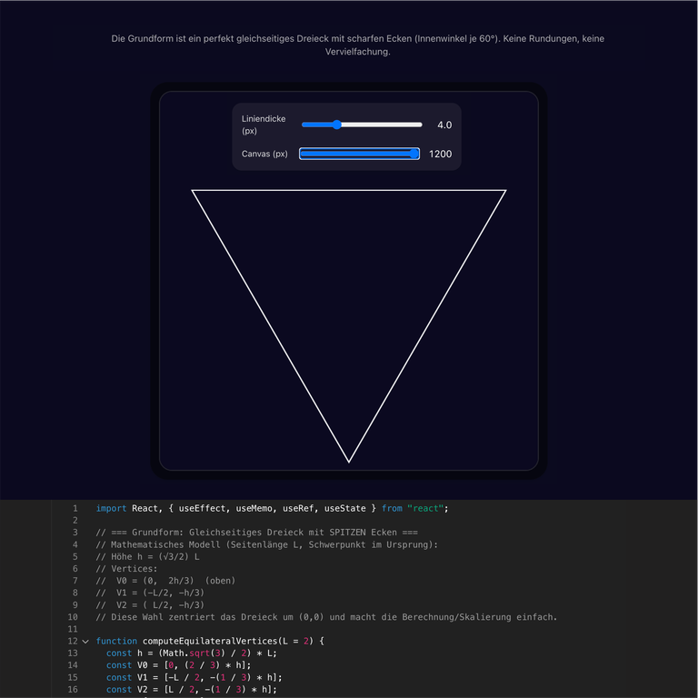 Aber nein. Purismus-Modus an. Ich wollte das Dreieck wirklich konstruieren (lassen): Punkte berechnen, Kanten definieren, alles Mathe. Wenn schon banal, dann bitte konsequent banal. Die eigentliche Fleißarbeit übernimmt natürlich die KI.