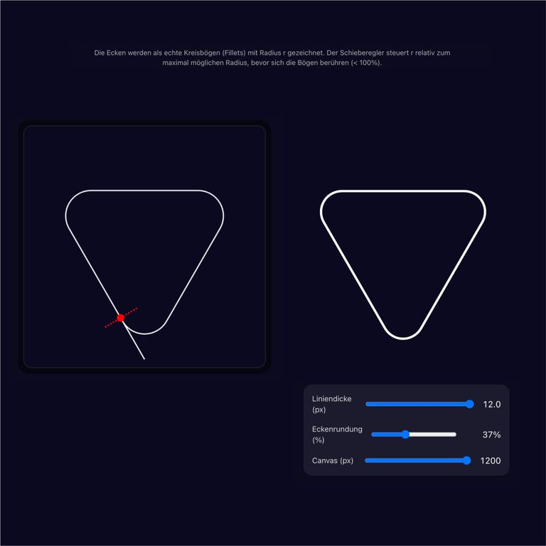Die Ecken sind echte Kreisbögen, der Schieberegler steuert, wie weit ich gehen darf, bevor sich die Bögen gegenseitig auf die Füße treten würden. Dazu noch Linienstärke und Canvas-Größe – fertig.