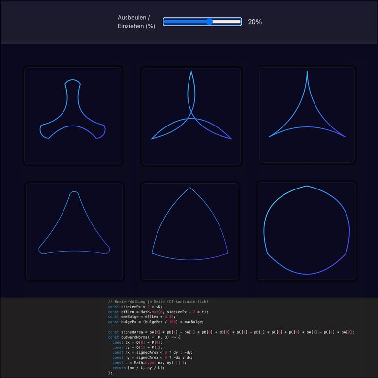 Als Nächstes geht’s ans Ausbeulen und Einziehen. Über einen einzigen Parameter werden die Kanten per Bézier-Kurven nach außen oder innen gezogen – und aus dem Dreieck wird auf einmal eine ganze Formenfamilie: mal eher Propeller, mal Blüte, mal Raumschiff-Emblem.